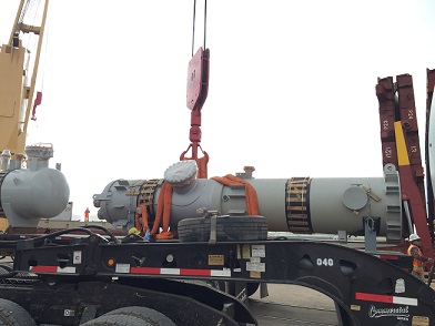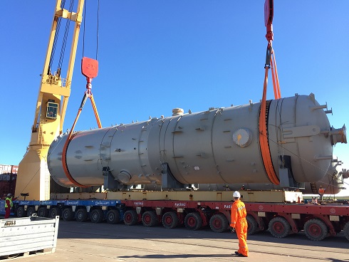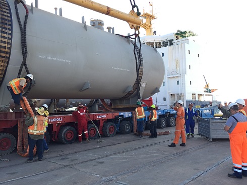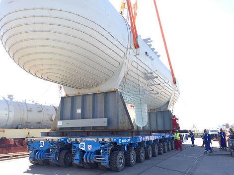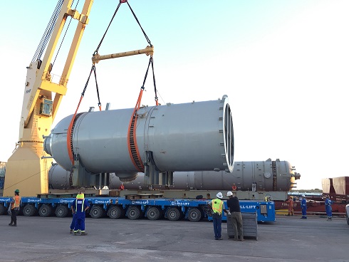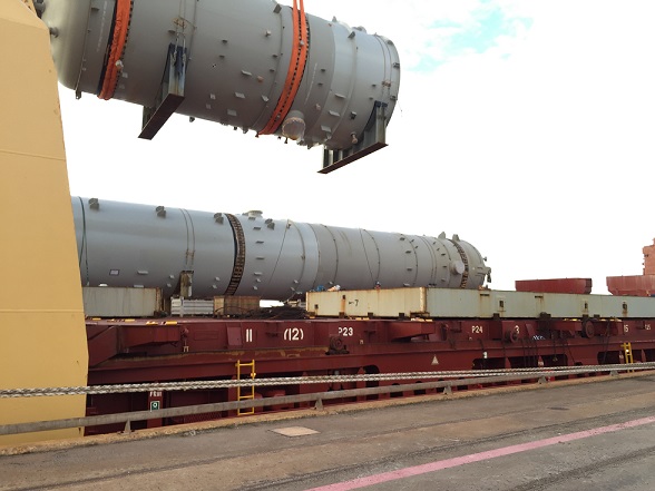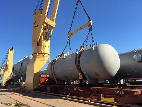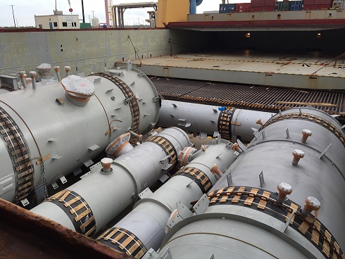 该项目第一批次共计发运10183计费吨货物,最大单件长度29米,最大单件重量110吨,主要为冷凝罐、存储器及吸鼓的大尺寸罐状货物。