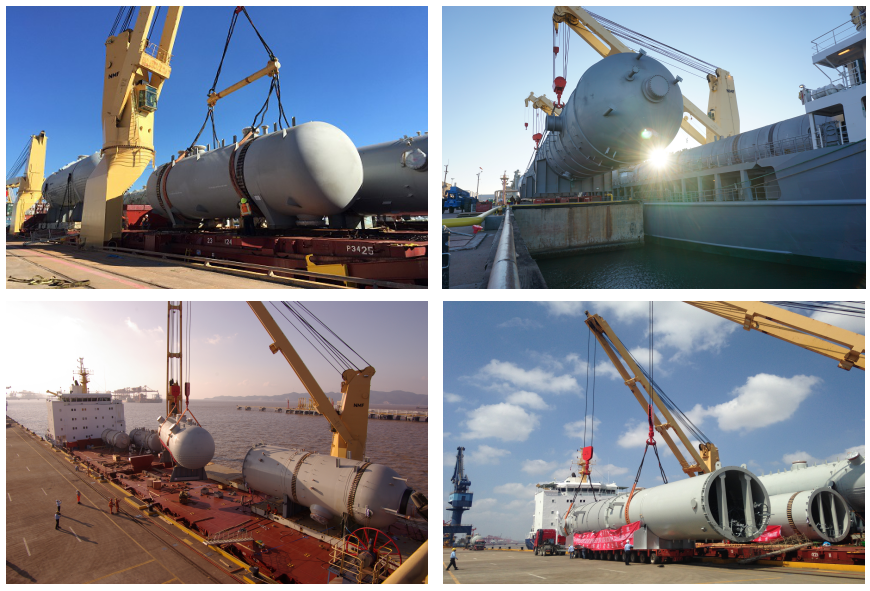 第一批次共计发运10183计费吨货物,最大单件长度29米,最大单件重量110吨,主要为冷凝罐、存储器及吸鼓的大尺寸罐状货物。在该批次货物的发运过程中,我们面对的问题主要是装货港为台塑宁波工厂的私有码头,这是该码头第一次进行出口货物装船作业,在安排船舶靠泊、协调装船队伍及船方工作、把控各环节工作衔接等方面都面临巨大挑战。同时宁波工厂也是第一次发运如此大批量的货物,在厂内生产、仓储、货物调配等方面也没有十分丰富的经验。
